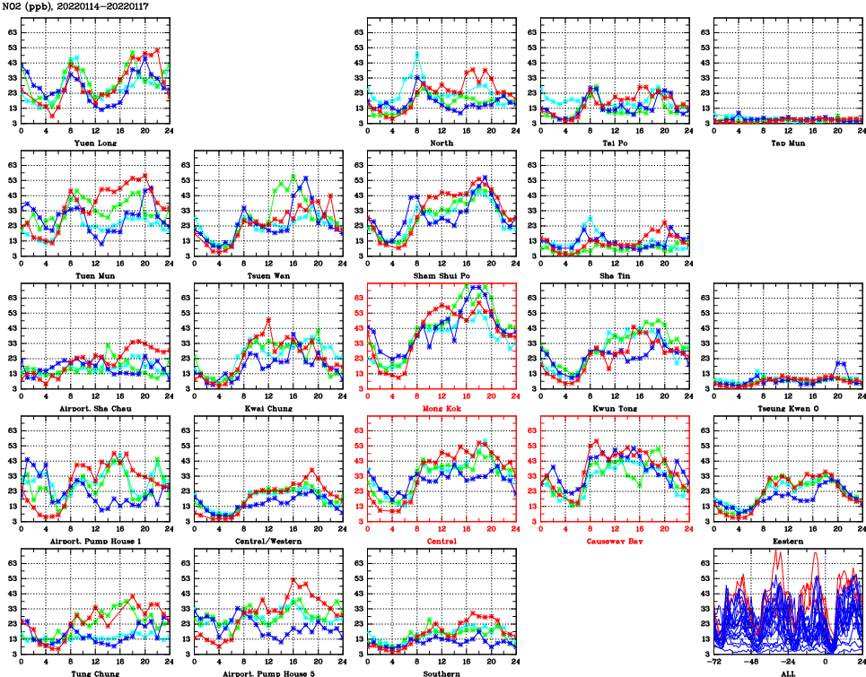| Air Quality Data Time Series for NO2 (2022/01/17) | ( Line colors: Day -3 Day -2 Day -1 Current day ) | 2D Map Current AQHI |