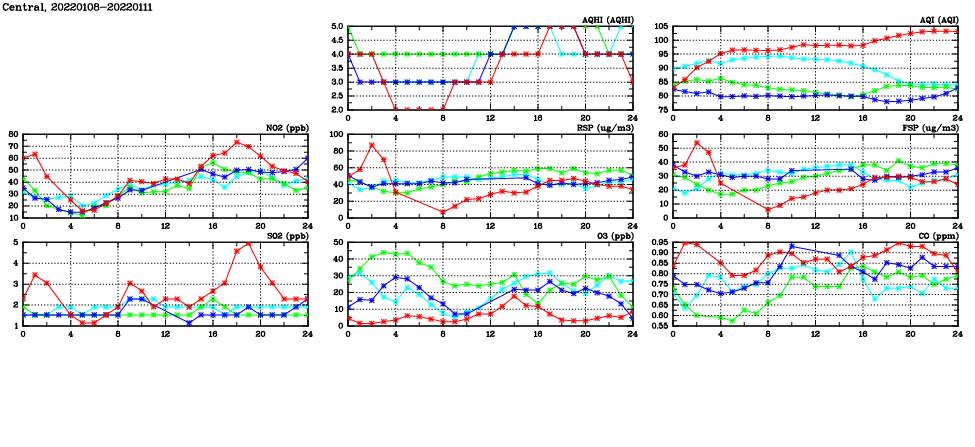 | Air Quality Data Time Series in Central (2022/01/11) | ( Line colors: Day -3 Day -2 Day -1 Current day ) | 2D Map Current AQHI |