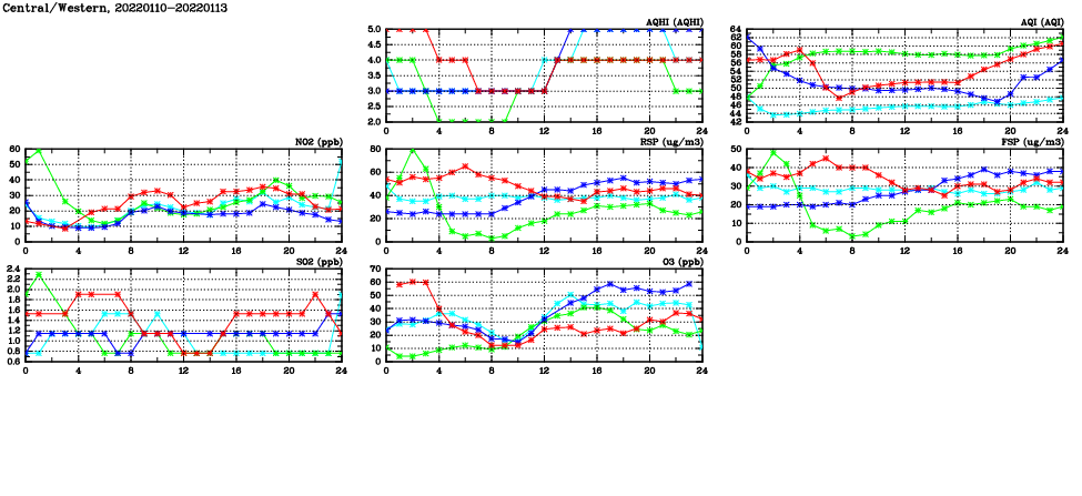 | Air Quality Data Time Series in Central/Western (2022/01/13) | ( Line colors: Day -3 Day -2 Day -1 Current day ) | 2D Map Current AQHI |