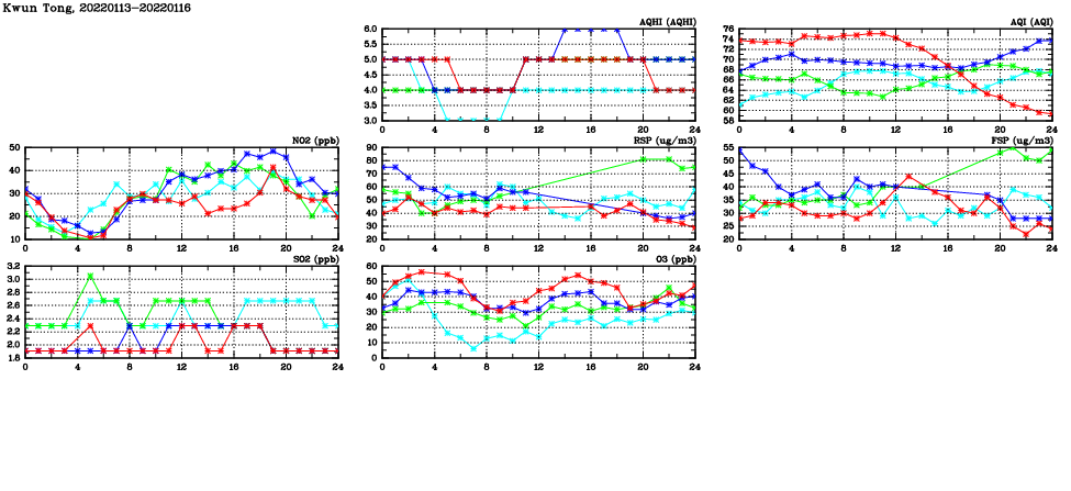 | Air Quality Data Time Series in Kwun Tong (2022/01/16) | ( Line colors: Day -3 Day -2 Day -1 Current day ) | 2D Map Current AQHI |