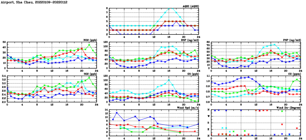 | Air Quality Data Time Series in Airport, Sha Chau (2022/01/12) | ( Line colors: Day -3 Day -2 Day -1 Current day ) | 2D Map Current AQHI |