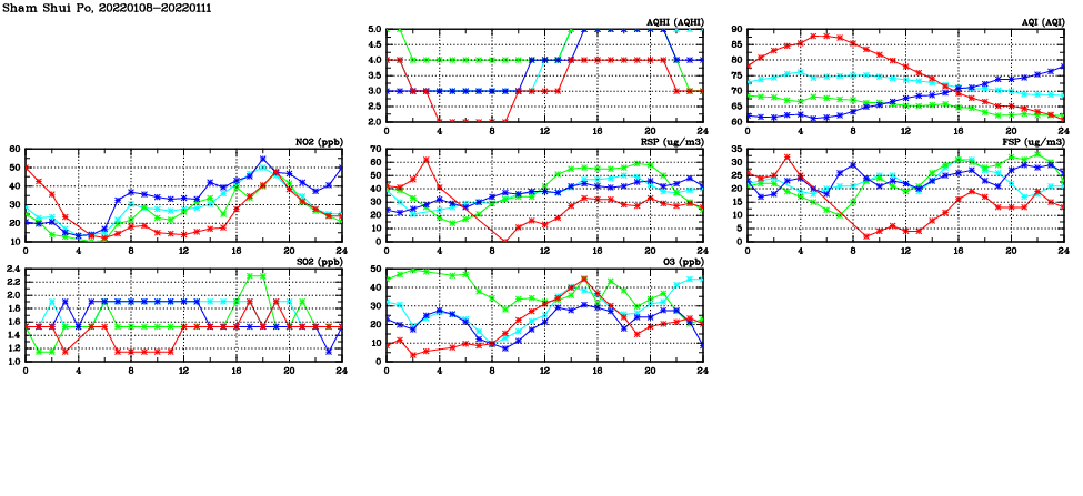 | Air Quality Data Time Series in Sham Shui Po (2022/01/11) | ( Line colors: Day -3 Day -2 Day -1 Current day ) | 2D Map Current AQHI |