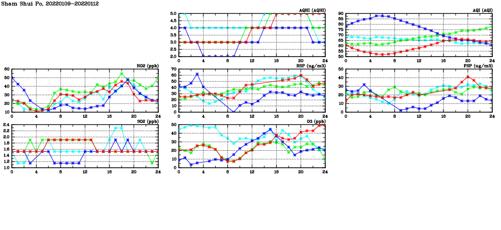 | Air Quality Data Time Series in Sham Shui Po (2022/01/12) | ( Line colors: Day -3 Day -2 Day -1 Current day ) | 2D Map Current AQHI |