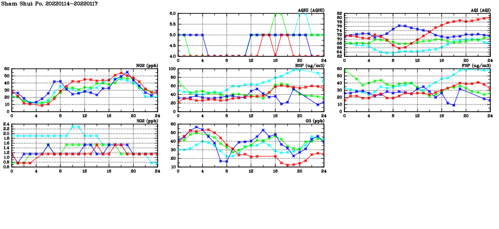 | Air Quality Data Time Series in Sham Shui Po (2022/01/17) | ( Line colors: Day -3 Day -2 Day -1 Current day ) | 2D Map Current AQHI |