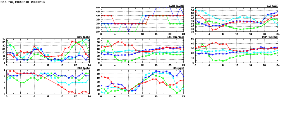 | Air Quality Data Time Series in Sha Tin (2022/01/13) | ( Line colors: Day -3 Day -2 Day -1 Current day ) | 2D Map Current AQHI |
