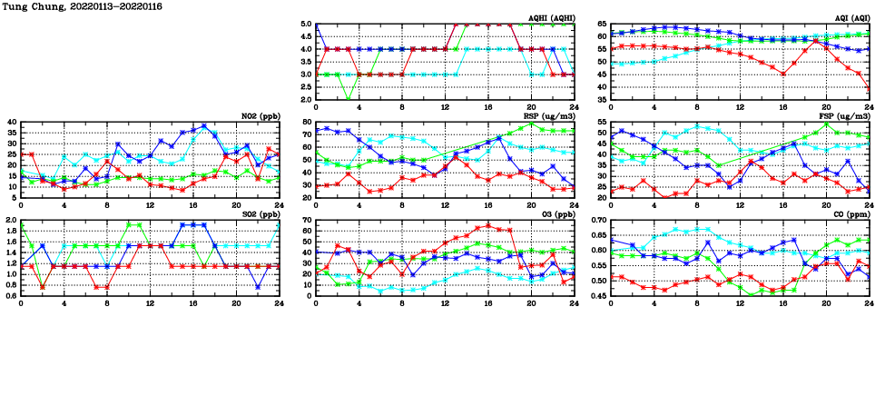| Air Quality Data Time Series in Tung Chung (2022/01/16) | ( Line colors: Day -3 Day -2 Day -1 Current day ) | 2D Map Current AQHI |