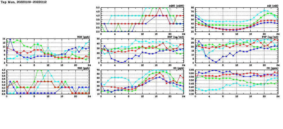 | Air Quality Data Time Series in Tap Mun (2022/01/12) | ( Line colors: Day -3 Day -2 Day -1 Current day ) | 2D Map Current AQHI |