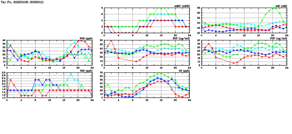 | Air Quality Data Time Series in Tai Po (2022/01/11) | ( Line colors: Day -3 Day -2 Day -1 Current day ) | 2D Map Current AQHI |