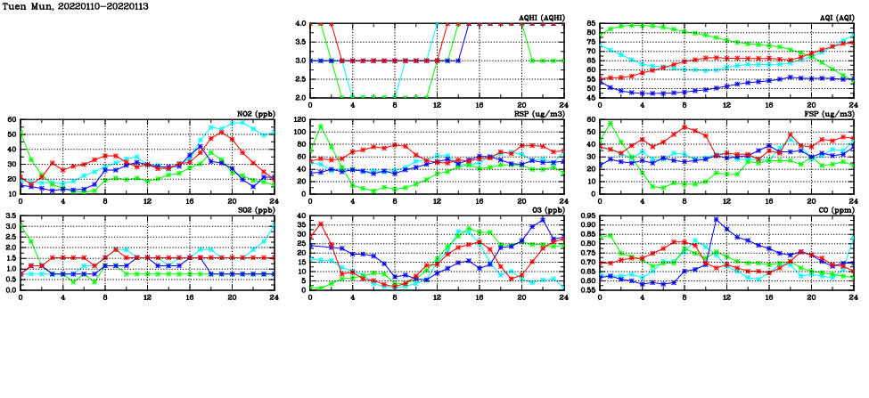 | Air Quality Data Time Series in Tuen Mun (2022/01/13) | ( Line colors: Day -3 Day -2 Day -1 Current day ) | 2D Map Current AQHI |