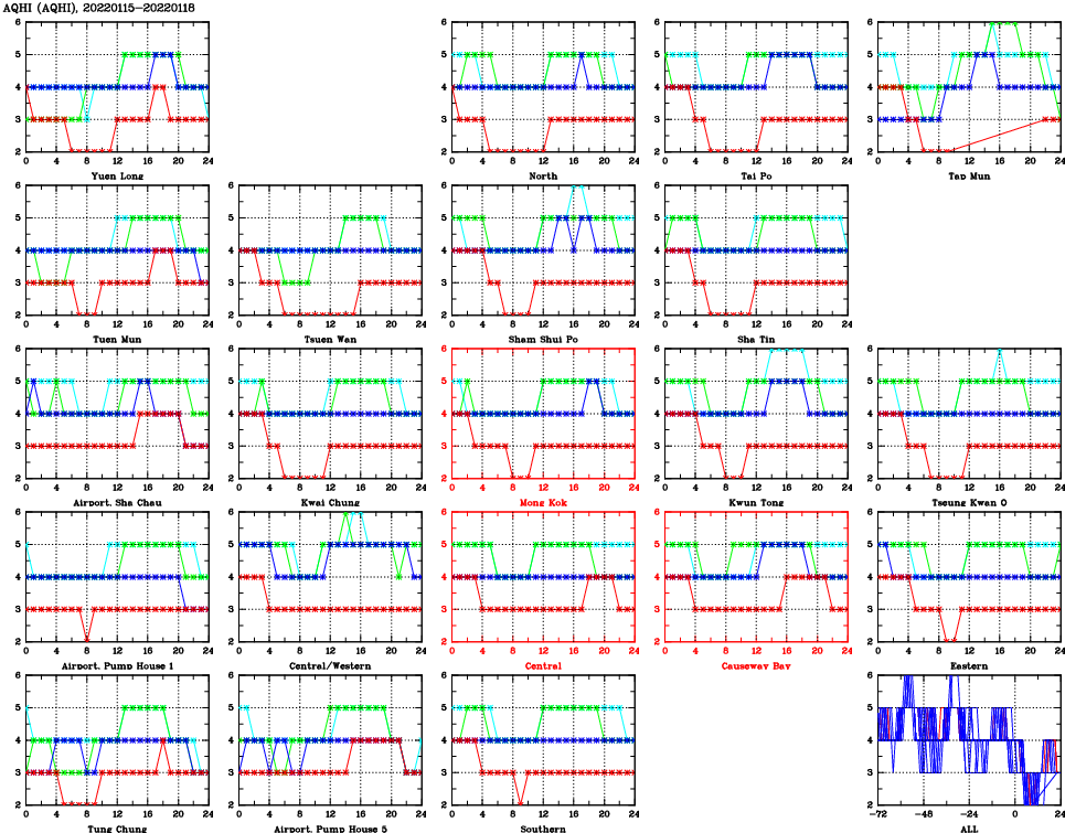 | Air Quality Data Time Series for AQHI (2022/01/18) | ( Line colors: Day -3 Day -2 Day -1 Current day ) | 2D Map Current AQHI |