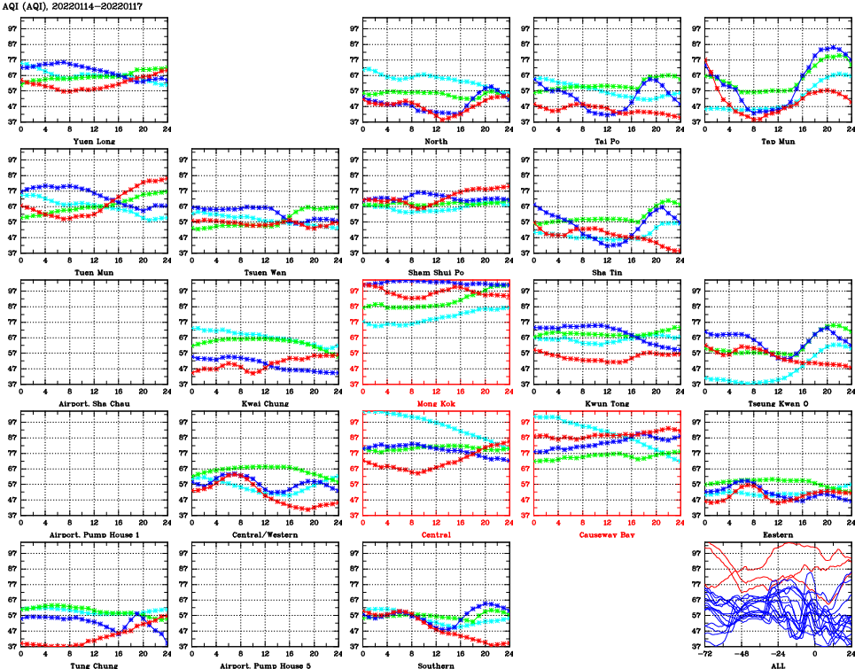 | Air Quality Data Time Series for AQI (2022/01/17) | ( Line colors: Day -3 Day -2 Day -1 Current day ) | 2D Map Current AQHI |