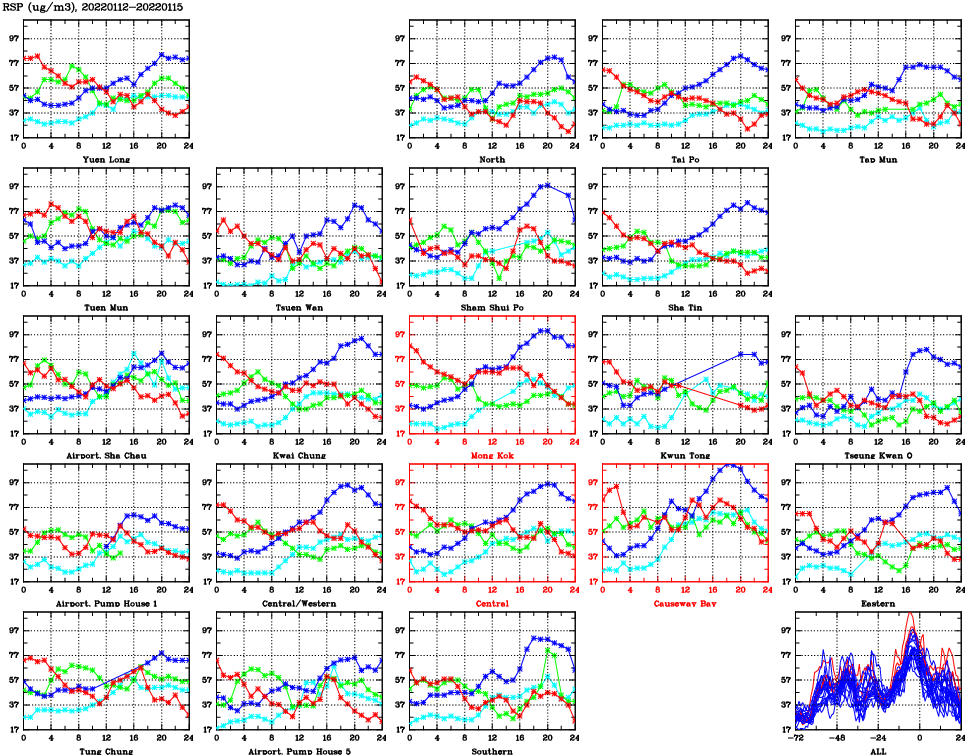 | Air Quality Data Time Series for RSP (2022/01/15) | ( Line colors: Day -3 Day -2 Day -1 Current day ) | 2D Map Current AQHI |
