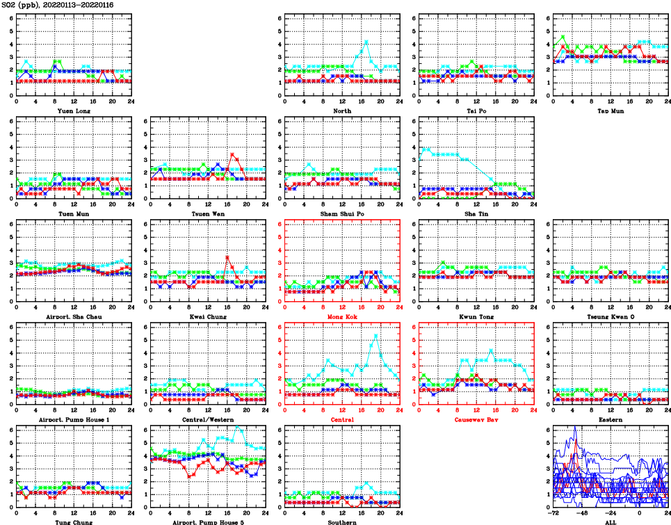 | Air Quality Data Time Series for SO2 (2022/01/16) | ( Line colors: Day -3 Day -2 Day -1 Current day ) | 2D Map Current AQHI |