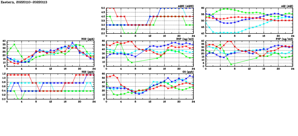 | Air Quality Data Time Series in Eastern (2022/01/13) | ( Line colors: Day -3 Day -2 Day -1 Current day ) | 2D Map Current AQHI |
