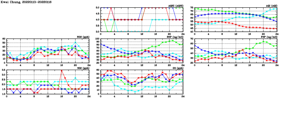 | Air Quality Data Time Series in Kwai Chung (2022/01/16) | ( Line colors: Day -3 Day -2 Day -1 Current day ) | 2D Map Current AQHI |