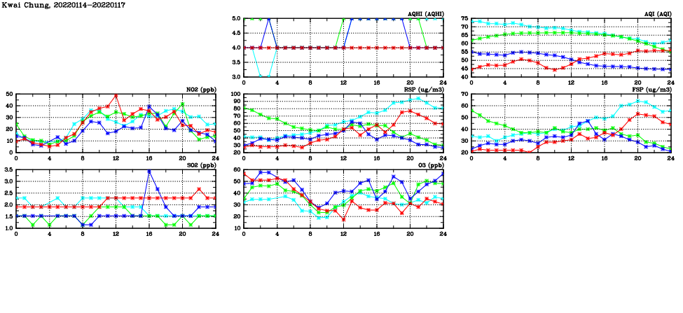 | Air Quality Data Time Series in Kwai Chung (2022/01/17) | ( Line colors: Day -3 Day -2 Day -1 Current day ) | 2D Map Current AQHI |