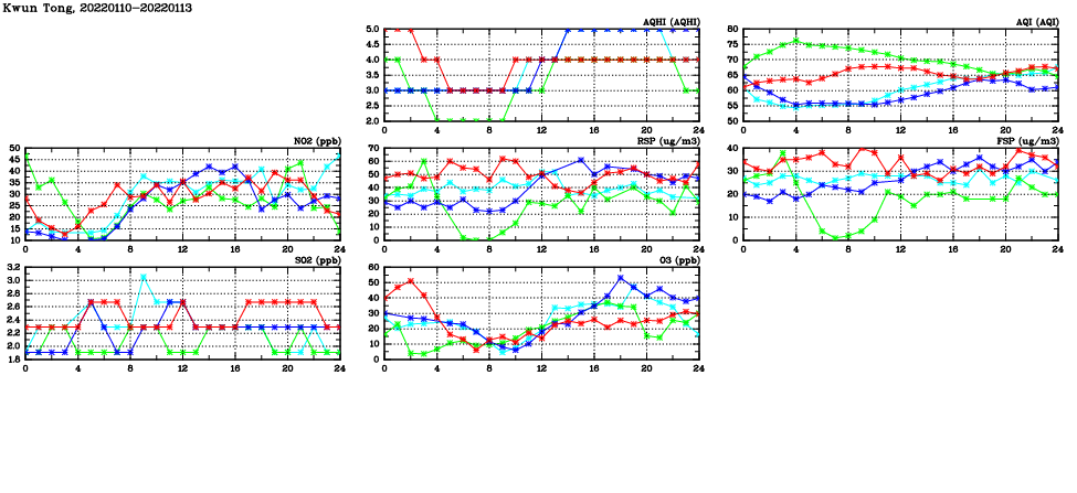 | Air Quality Data Time Series in Kwun Tong (2022/01/13) | ( Line colors: Day -3 Day -2 Day -1 Current day ) | 2D Map Current AQHI |
