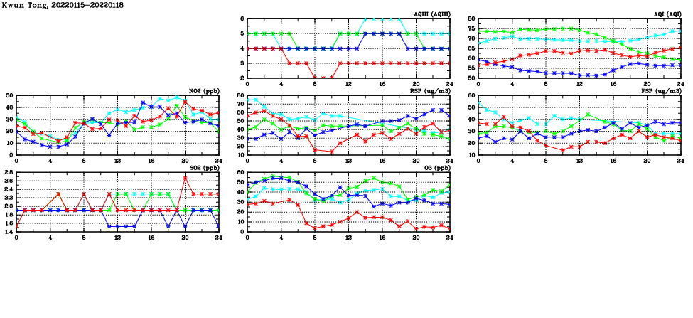 | Air Quality Data Time Series in Kwun Tong (2022/01/18) | ( Line colors: Day -3 Day -2 Day -1 Current day ) | 2D Map Current AQHI |