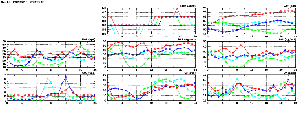 | Air Quality Data Time Series in North (2022/01/13) | ( Line colors: Day -3 Day -2 Day -1 Current day ) | 2D Map Current AQHI |