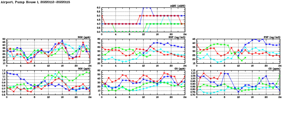 | Air Quality Data Time Series in Airport, Pump House 1 (2022/01/15) | ( Line colors: Day -3 Day -2 Day -1 Current day ) | 2D Map Current AQHI |