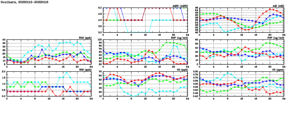 | Air Quality Data Time Series in Southern (2022/01/16) | ( Line colors: Day -3 Day -2 Day -1 Current day ) | 2D Map Current AQHI |