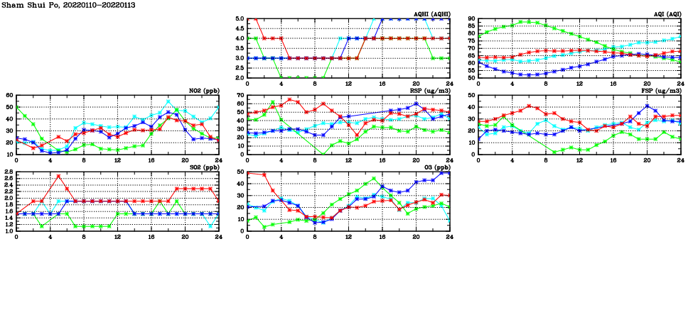 | Air Quality Data Time Series in Sham Shui Po (2022/01/13) | ( Line colors: Day -3 Day -2 Day -1 Current day ) | 2D Map Current AQHI |