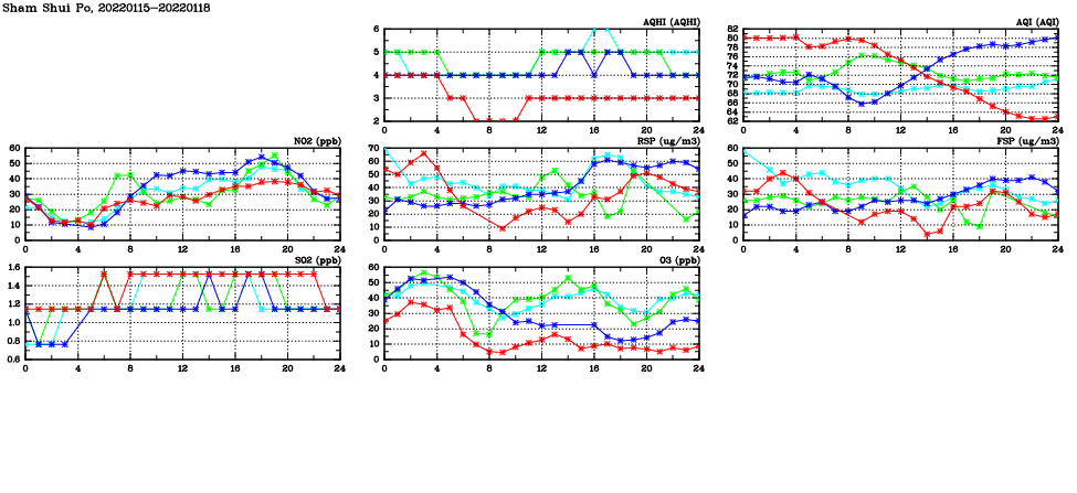 | Air Quality Data Time Series in Sham Shui Po (2022/01/18) | ( Line colors: Day -3 Day -2 Day -1 Current day ) | 2D Map Current AQHI |