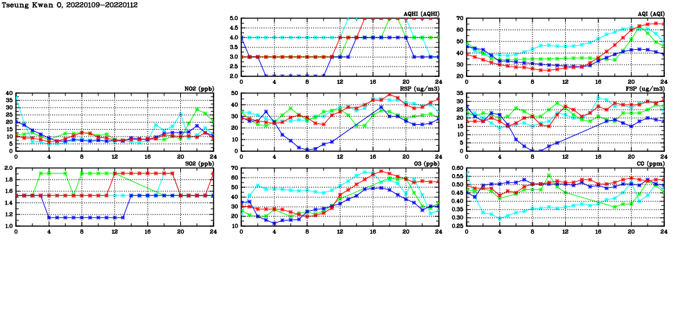 | Air Quality Data Time Series in Tseung Kwan O (2022/01/12) | ( Line colors: Day -3 Day -2 Day -1 Current day ) | 2D Map Current AQHI |