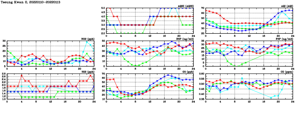 | Air Quality Data Time Series in Tseung Kwan O (2022/01/13) | ( Line colors: Day -3 Day -2 Day -1 Current day ) | 2D Map Current AQHI |
