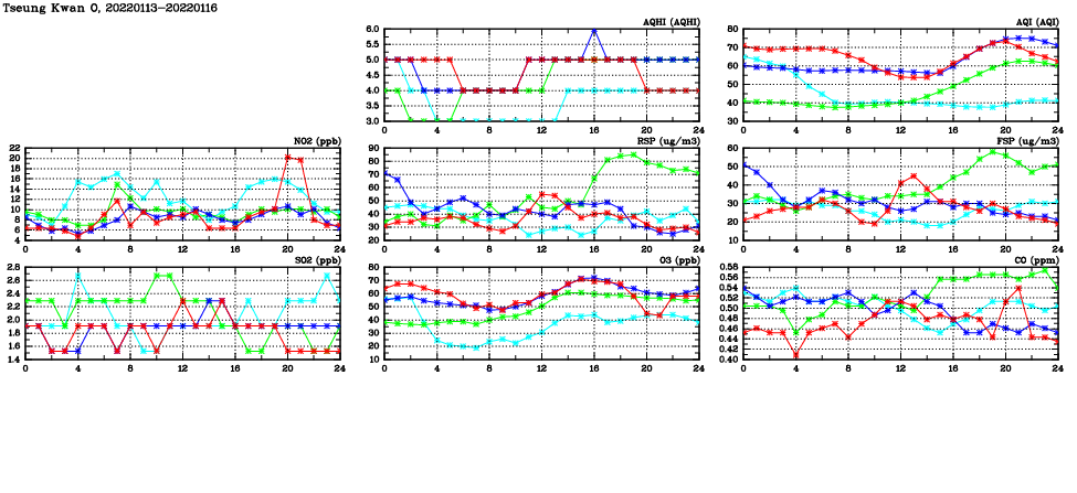 | Air Quality Data Time Series in Tseung Kwan O (2022/01/16) | ( Line colors: Day -3 Day -2 Day -1 Current day ) | 2D Map Current AQHI |