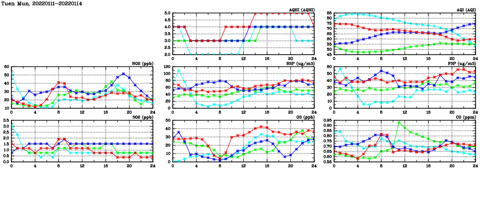 | Air Quality Data Time Series in Tuen Mun (2022/01/14) | ( Line colors: Day -3 Day -2 Day -1 Current day ) | 2D Map Current AQHI |