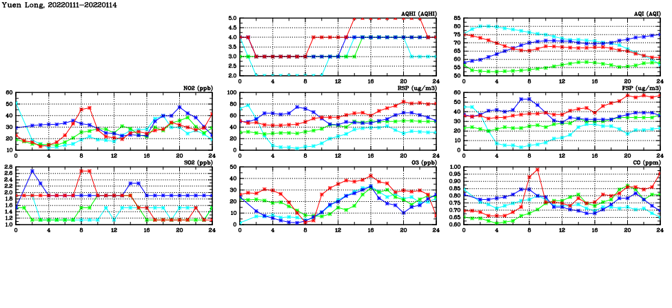 | Air Quality Data Time Series in Yuen Long (2022/01/14) | ( Line colors: Day -3 Day -2 Day -1 Current day ) | 2D Map Current AQHI |