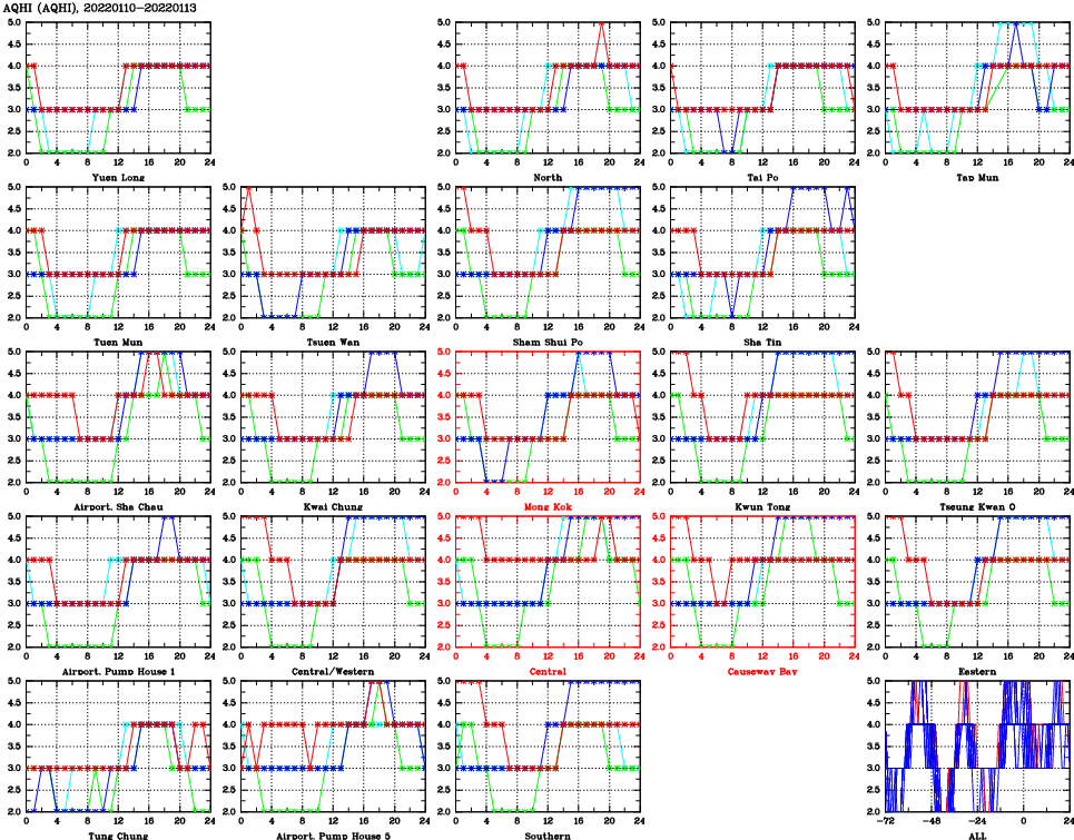 | Air Quality Data Time Series for AQHI (2022/01/13) | ( Line colors: Day -3 Day -2 Day -1 Current day ) | 2D Map Current AQHI |