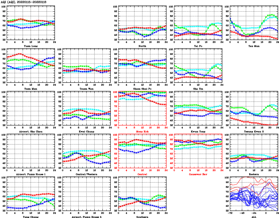 | Air Quality Data Time Series for AQI (2022/01/18) | ( Line colors: Day -3 Day -2 Day -1 Current day ) | 2D Map Current AQHI |