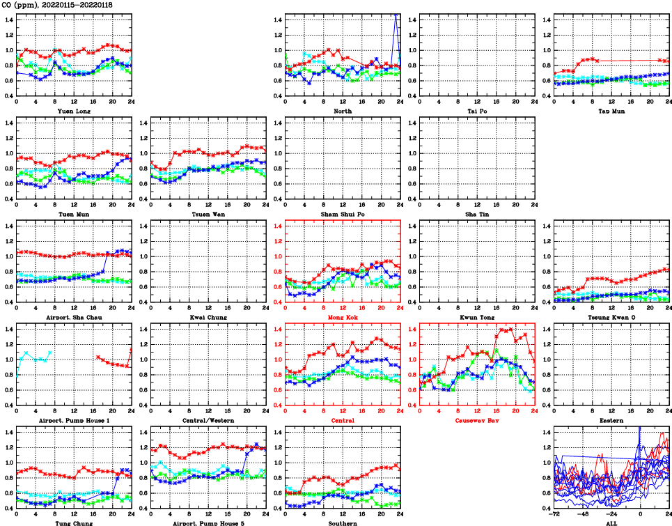 | Air Quality Data Time Series for CO (2022/01/18) | ( Line colors: Day -3 Day -2 Day -1 Current day ) | 2D Map Current AQHI |