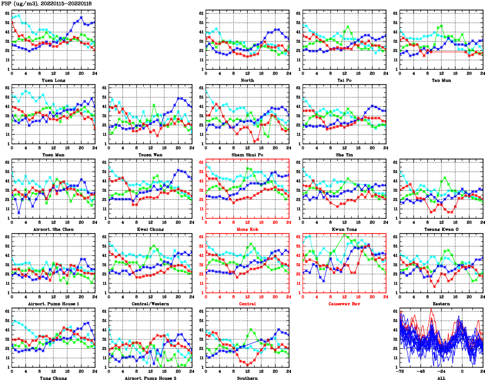 | Air Quality Data Time Series for FSP (2022/01/18) | ( Line colors: Day -3 Day -2 Day -1 Current day ) | 2D Map Current AQHI |