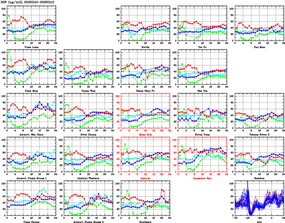 | Air Quality Data Time Series for RSP (2022/01/13) | ( Line colors: Day -3 Day -2 Day -1 Current day ) | 2D Map Current AQHI |