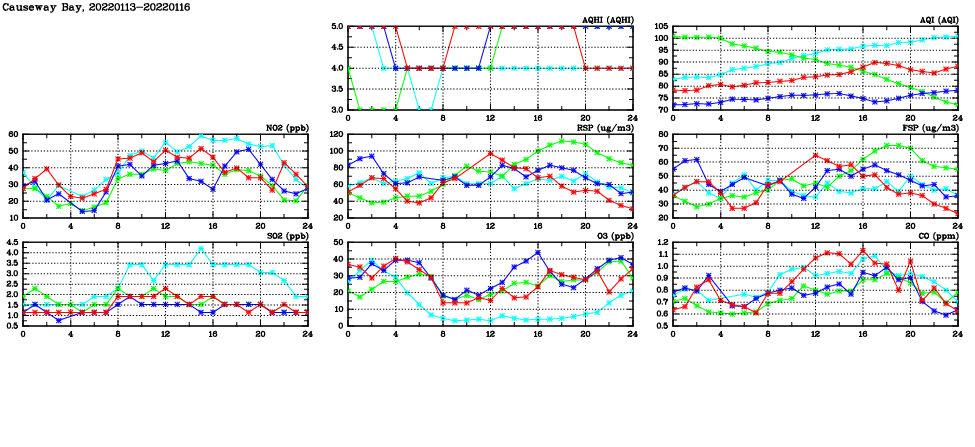 | Air Quality Data Time Series in Causeway Bay (2022/01/16) | ( Line colors: Day -3 Day -2 Day -1 Current day ) | 2D Map Current AQHI |