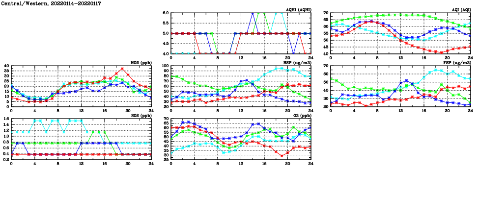 | Air Quality Data Time Series in Central/Western (2022/01/17) | ( Line colors: Day -3 Day -2 Day -1 Current day ) | 2D Map Current AQHI |