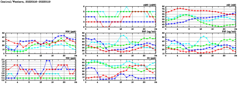 | Air Quality Data Time Series in Central/Western (2022/01/19) | ( Line colors: Day -3 Day -2 Day -1 Current day ) | 2D Map Current AQHI |
