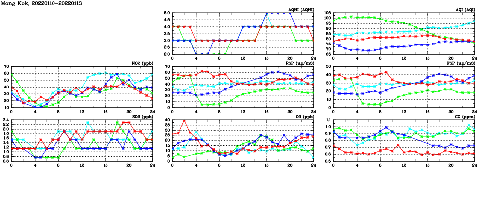 | Air Quality Data Time Series in Mong Kok (2022/01/13) | ( Line colors: Day -3 Day -2 Day -1 Current day ) | 2D Map Current AQHI |