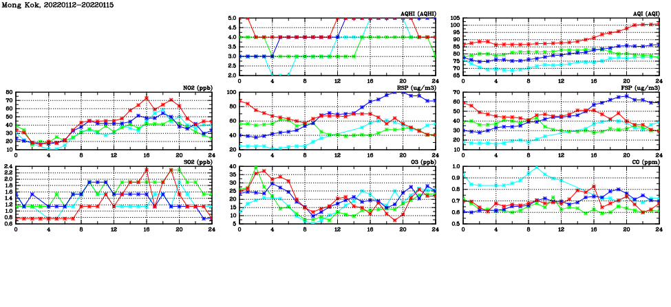 | Air Quality Data Time Series in Mong Kok (2022/01/15) | ( Line colors: Day -3 Day -2 Day -1 Current day ) | 2D Map Current AQHI |