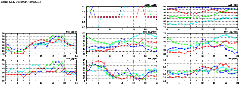 | Air Quality Data Time Series in Mong Kok (2022/01/17) | ( Line colors: Day -3 Day -2 Day -1 Current day ) | 2D Map Current AQHI |