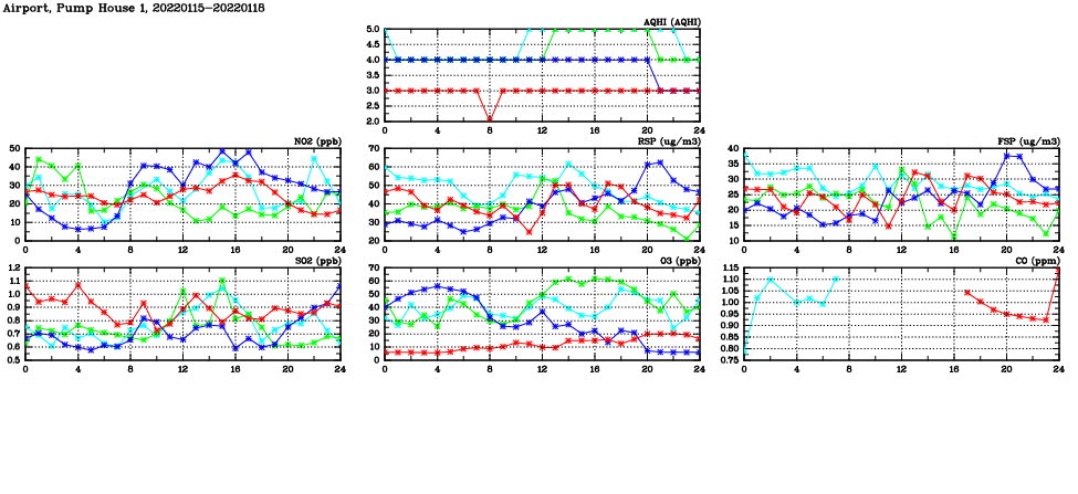 | Air Quality Data Time Series in Airport, Pump House 1 (2022/01/18) | ( Line colors: Day -3 Day -2 Day -1 Current day ) | 2D Map Current AQHI |