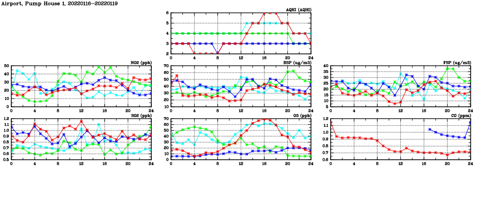 | Air Quality Data Time Series in Airport, Pump House 1 (2022/01/19) | ( Line colors: Day -3 Day -2 Day -1 Current day ) | 2D Map Current AQHI |