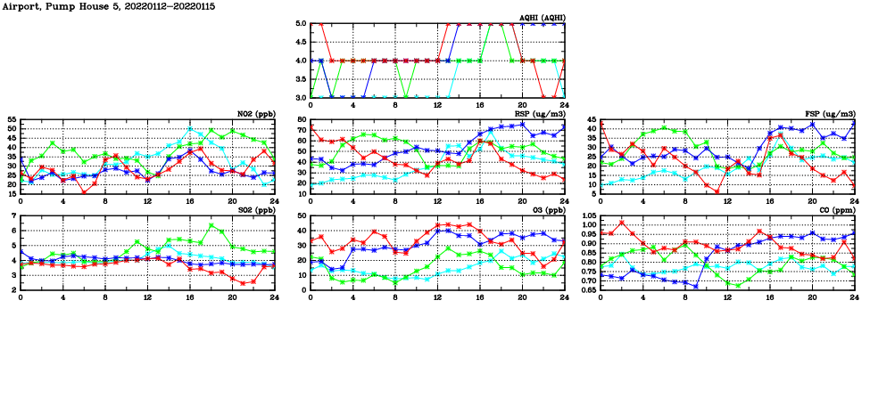 | Air Quality Data Time Series in Airport, Pump House 5 (2022/01/15) | ( Line colors: Day -3 Day -2 Day -1 Current day ) | 2D Map Current AQHI |