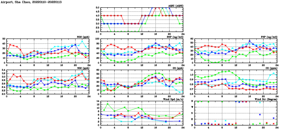 | Air Quality Data Time Series in Airport, Sha Chau (2022/01/13) | ( Line colors: Day -3 Day -2 Day -1 Current day ) | 2D Map Current AQHI |