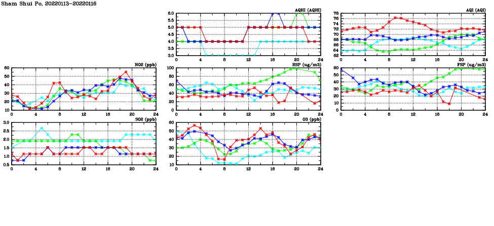 | Air Quality Data Time Series in Sham Shui Po (2022/01/16) | ( Line colors: Day -3 Day -2 Day -1 Current day ) | 2D Map Current AQHI |