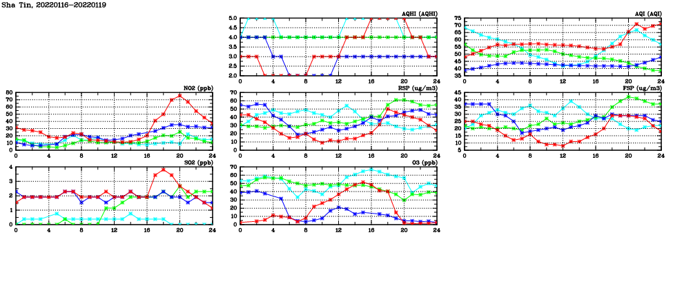 | Air Quality Data Time Series in Sha Tin (2022/01/19) | ( Line colors: Day -3 Day -2 Day -1 Current day ) | 2D Map Current AQHI |