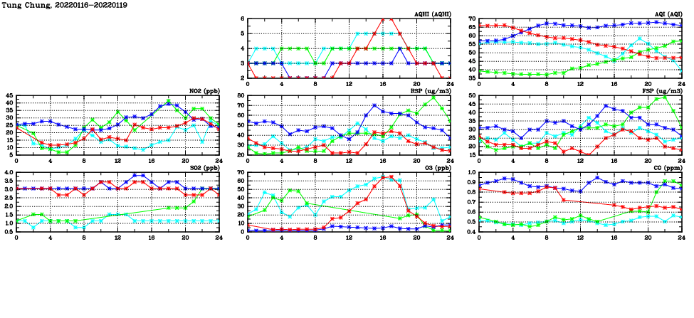 | Air Quality Data Time Series in Tung Chung (2022/01/19) | ( Line colors: Day -3 Day -2 Day -1 Current day ) | 2D Map Current AQHI |